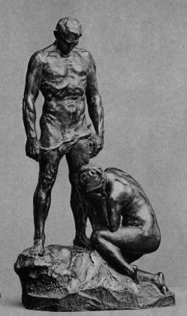 Eberlein versucht in seiner Darstellung den Augenblick zu erfassen, als Adam und Eva ihr Vergehen bewusst wird. Sie bereuen ihre Tat. Ratlosigkeit und Betroffenheit machen sich breit. Adam steht aufrecht auf einem Felsengrund. Aber er schaut mit gesenktem Kopf zu Boden. Und Eva vergräbt, auf die Knie gesunken, ihr Gesicht in beide Hände. Was soll werden? Der gute in der Schöpfungsgeschichte noch beschriebene harmonische Urzustand ist zerbrochen. Verantwortung und Freiheit für alles Tun und Lassen zu leben steht ihnen jetzt bevor - unter ganz neuen Voraussetzungen.