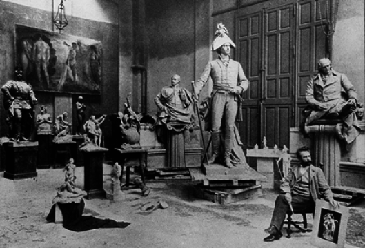 Das Foto soll einen Eindruck von der Werkstatt Eberleins wiedergeben. Es zeigt sein Atelier in Berlin, Lützowufer 29 um 1900. Es sind Gipsmodelle zu sehen, die für die Marmoraus-führung vollendet dastehen, umgeben von einer Fülle anderer Werke. Rechts sitzt der Künstler Gustav Eberlein, der ein Foto des Werkes "Gottvater haucht Adam den Odem ein" (16*) zeigt. Im Hintergrund unter dem Gemälde ist eine "Psyche" (19*) zu erkennen. Die große Figur im Vordergrund, Friedrich Wilhelm III (1770 - 1840), stellt die Hauptfigur einer Gruppe der Siegesallee dar. Sie gehört zu dem kleinen Modell neben der Skulptur. Links im Vordergrund sieht man das Werk "Die Strafe“ (8*) auf einem niedrigen Sockel, auf dem ein dunkles Tuch drapiert worden ist.
