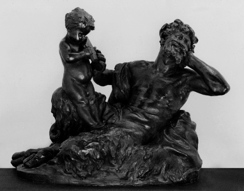 Eine der wenigen Bronzeplastiken,die im Städtischen Museum Münden vorhanden sind, zeigt, wie der Gott Pan einem Kleinkind, seine Panflöte zum Spielen reicht, der kleine Junge aber keinen richtigen Ton zu treffen scheint, so dass sich Pan über das falsche Flötenspiel amüsiert. Der kleine unbekleidete Junge sitzt auf dem rechten Bein von Pan, welches mit Fell besetzt ist und am Ende einen Huf zeigt. Mit seinen Beinen stößt sich der Junge vom anderen Oberschenkel von Pan ab und gerät auf diese Weise auf Augenhöhe mit Pan. Dieser hält sich mit seiner linken Hand sein linkes Ohr zu, da die gespielten Töne des Knaben allzu schief und schrill gespielt zu sein scheinen und greift mit seiner rechten Hand zur Panflöte, um diese an den unteren Luftlöchern mit seinen Fingern zuzuhalten, so dass die falschen Töne etwas gedämpfter erklingen. Der Gesichtsausdruck Pans zeigt ein Lächeln, welches verdeutlicht, dass sich der Gott über das ungeübte Flötenspiel des kleinen Jungen freut und zugleich Verständnis dafür hat, dass das Kind noch zu klein ist, um gekonnt der Panflöte die richtigen Töne zu entlocken.