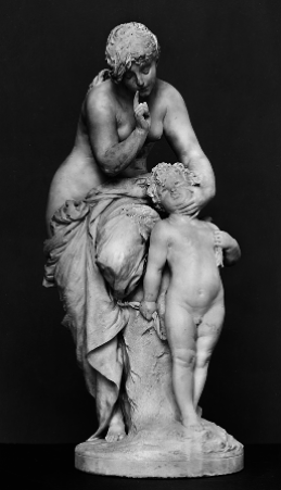 Amor wurde von den Römern aus dem griechischen übernommen. Er hatte nur wenige der erhabenen Eigenschaften des Eros, sondern wurde als Gott angesehen, der in Gestalt eines Knaben Unheil anrichtet. In der Zeit zwischen 1885 und 1895 behandelte Eberlein Szenen mit mythologischen Inhalten. In den „Venus und Amor“- Gruppen" verarbeitete der Künstler Beobachtungen, die er bei seiner Frau Helene und dem gemeinsamen Sohn Anzio gemacht hatte.