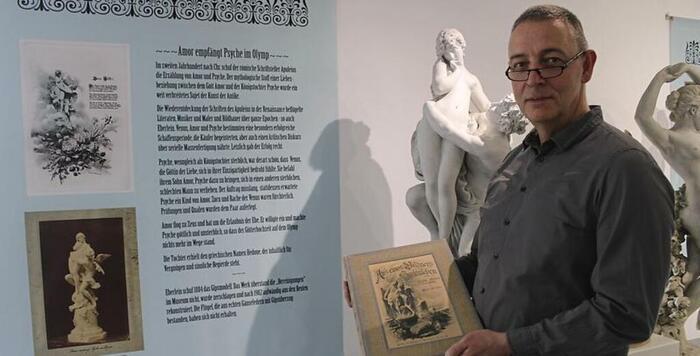 Museumsleiter Stefan Schäfer hat die Ausstellung unter dem Titel „Aus eines Bildners Seelenleben“ konzipiert. Es ist zugleich der Name eines Buches, mit dem der Mündener Künstler Gustav Eberlein auf dem Höhepunkt seines Schaffens sich und sein Werk selbst präsentiert. Textfahnen erläutern die Zusammenhänge. © Fotos: Ekkehard Maass